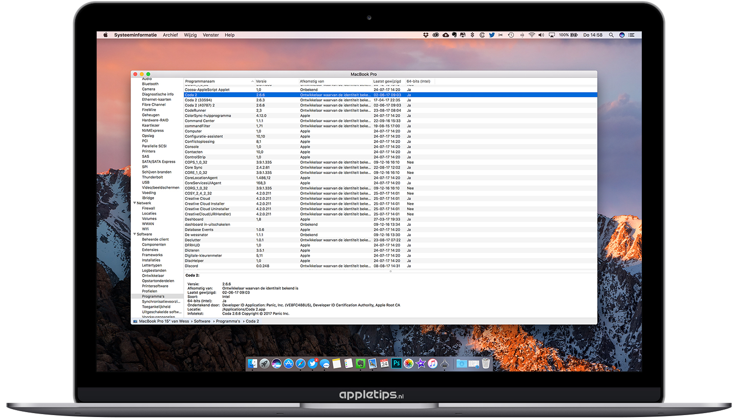 Daarnaast kun je de informatie ook raadplegen via ▸ Over deze Mac ▸ Systeemoverzicht. Scroll in de kolom naar beneden tot de categorie 'Software' en open de menuoptie 'Apps' of 'Programma's'.