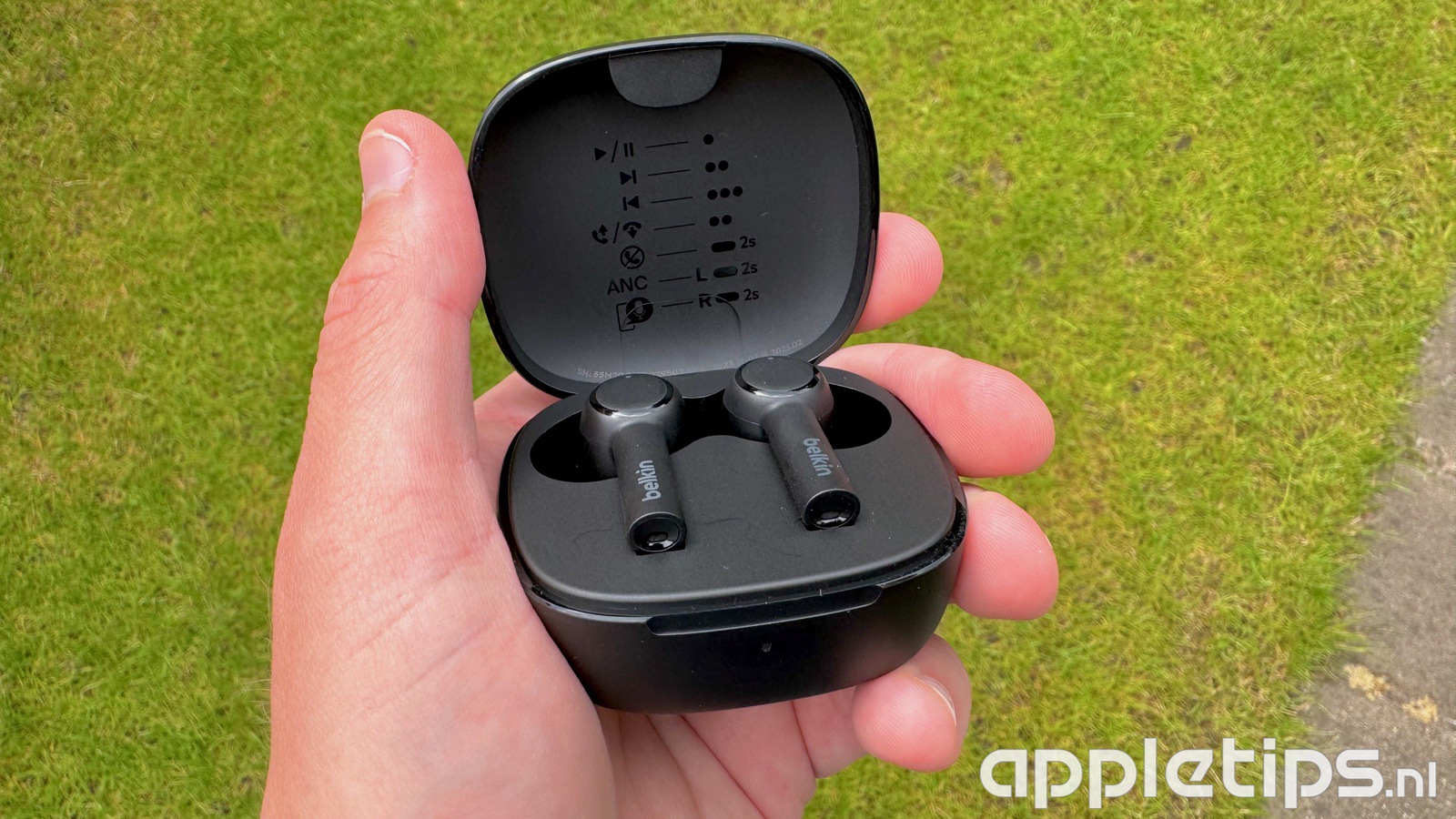De meegeleverde oplaadcase zorgt ervoor dat je de earbuds kunt opbergen en gelijktijdig opladen. Aan de binnenkant van de deksel vind je een handig overzicht van de aanraakbediening die je kunt gebruiken op de earbuds.