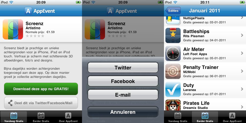 Deze maand wordt AppEvent voor de vierde maal georganiseerd. Heel de maand mei krijgen we dus een gratis app van een Nederlandse of Belgische iOS ontwikkelaar. De AppEvent app is een zeer complete app met alles wat je nodig hebt om AppEvent te volgen. Wanneer je de app opent krijg je meteen de app die vandaag gratis is te zien met een linkje naar de App Store en de mogelijkheid om dit via Twitter, Facebook en email te delen.