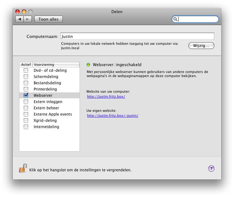 Het eerste wat we doen is de ingebouwde 'Webserver' activeren, dit doen we door naar ▸ Systeemvoorkeuren ▸ Delen te gaan, het onderstaande venster zal nu verschijnen: