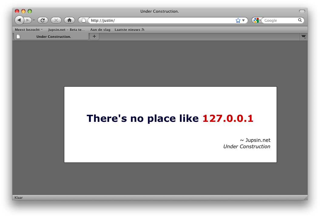 Je kunt de website benaderen door simpelweg je computernaam of het lokale IP-adres in te voeren in Safari of een andere webbrowser. Mijn Mac heeft de naam "Justin". Dus ik kom op mijn lokale website via de url http://Justin, eventueel kun je ook http://localhost of http://127.0.0.1 hiervoor gebruiken. Ook zonder een eigen content in de map te plaatsen kun je de webserver testen, Mac OS X plaatst namelijk een standaard welkomstpagina in de map tijdens de installatie.