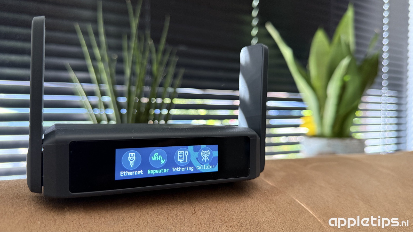 Via het touchscreen kun je QR-codes scannen om apparaten met wifi te verbinden, real-time netwerkstatus en snelheden bekijken, en direct VPN-verbindingen (zoals OpenVPN of WireGuard) of Tor inschakelen en uitschakelen. Ook kun je snel schakelen tussen verschillende verbindingsmodi, zoals ethernet, repeater, tethering en mobiel internet, waarbij de actieve modus met kleuren wordt aangegeven.