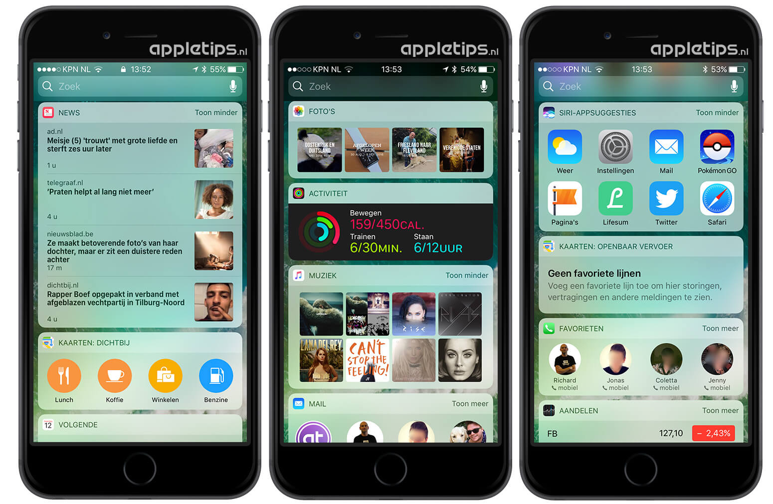 Zo kun je de widgets vanaf nu ook op het toegangsscherm raadplegen door naar rechts te vegen. Als je iPhone of iPad is ontgrendeld kun je de widgets ook raadplegen vanaf de eerste pagina op het beginscherm (naar rechts vegen). Tot slot zijn de widgets ook te bekijken via het berichtencentrum zoals voorheen.