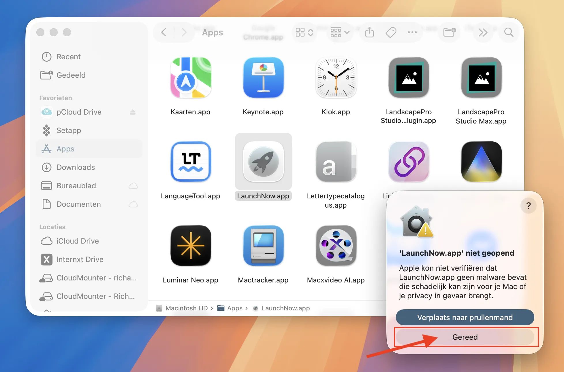 3. Open LaunchNow vanuit de map 'Apps', de eerste keer zal er een melding verschijnen dat de App niet gevetfieerd kan worden, klik op 'Gereed' in deze melding.