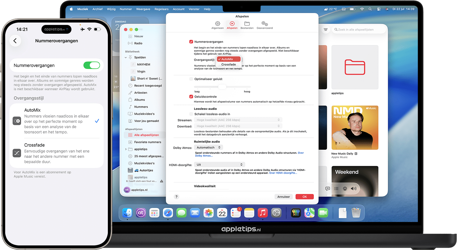 Op een Mac kun je dit inschakelen via Muziek ▸ Menubalk ▸ Muziek ▸ Instellingen ▸ Afspelen ▸ schakel de optie 'Nummerovergangen' in. Klik bij 'Overgangsstijl' op 'AutoMix'.