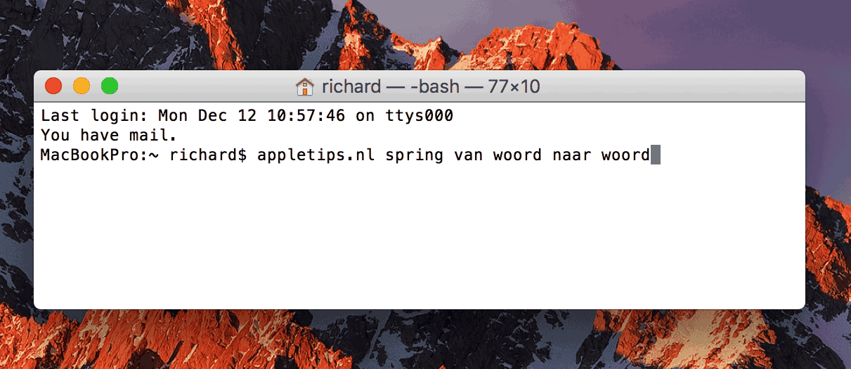 Om te kunnen springen naar het vorige of volgende woord in Terminal gebruik je de alt/option-toets in combinatie met de pijltoetsen links en rechts.