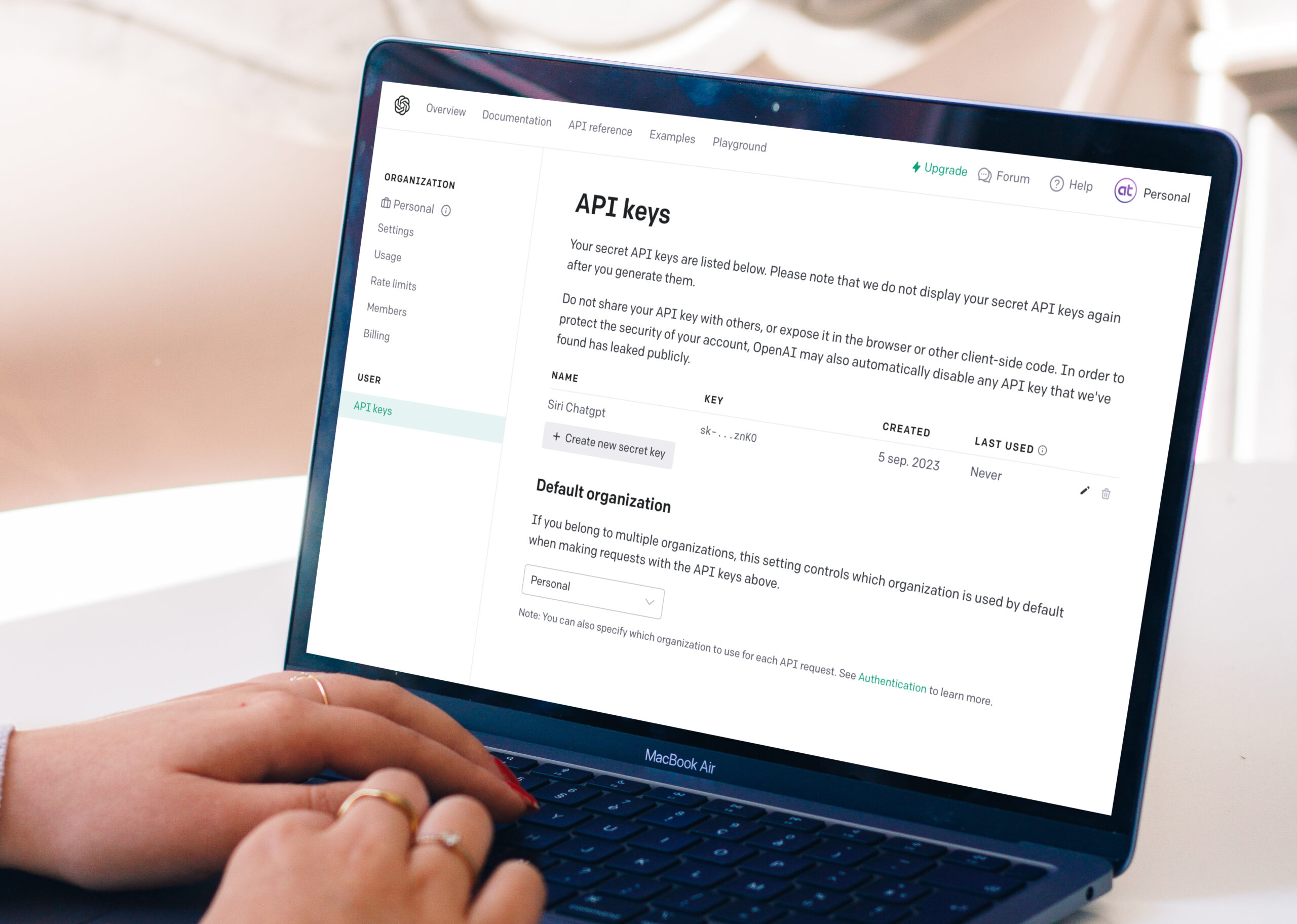 - Selecteer “View API Keys” en klik op “Create new secret key”.